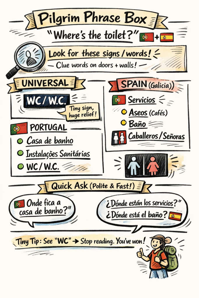 In the glamorous locations you’d expect: cafés, bars, restaurants, municipal toilets, petrol stations… and occasionally nature (handled thoughtfully and discreetly). The practical rhythm is simple: go when you see a chance, not when you hit crisis levels. Carry tissues, a little hand sanitiser, and a small zip bag for rubbish—because “leave no trace” is not just a slogan, it’s basic pilgrim manners.